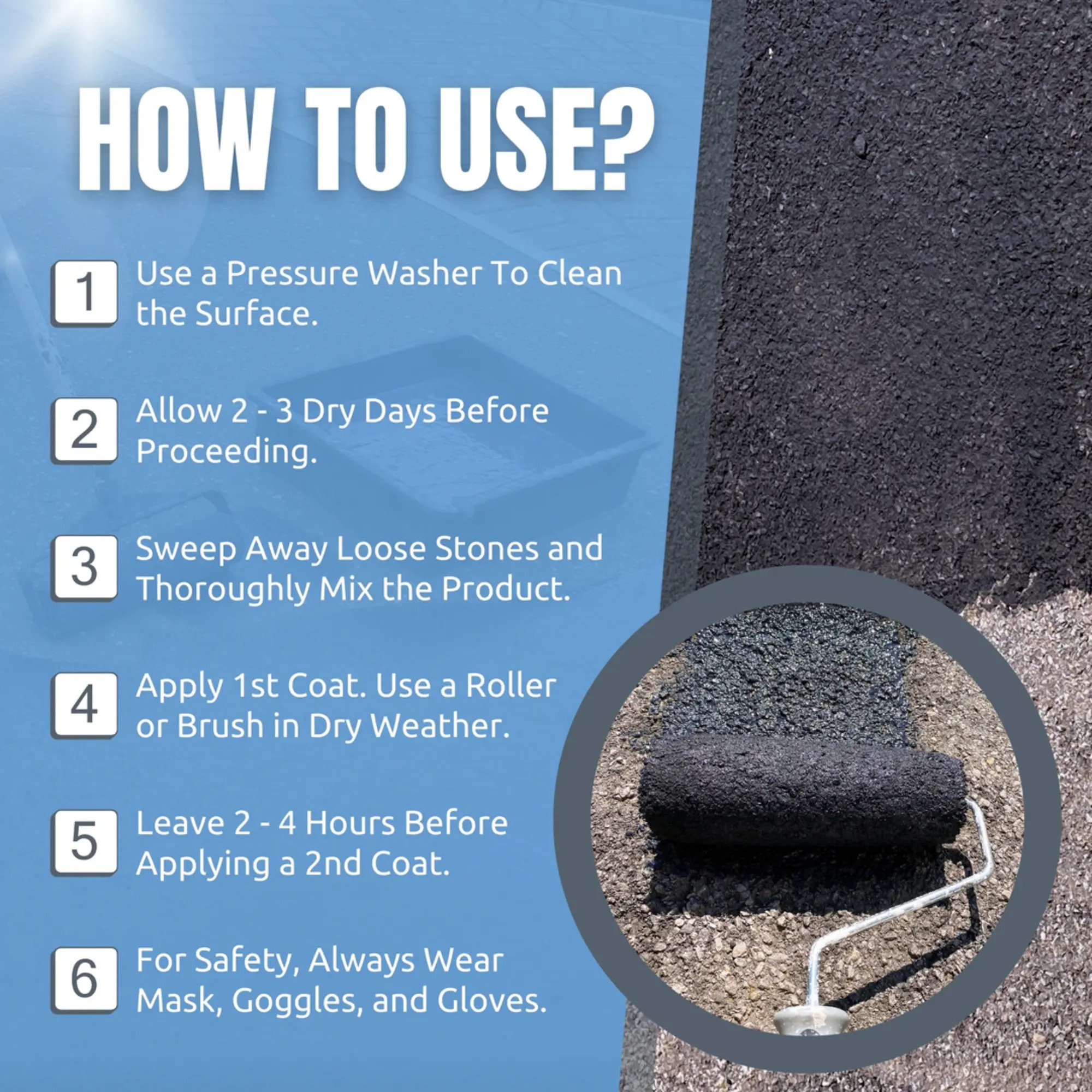 Ensure the surface is thoroughly cleaned with a pressure washer or jet washer. Allow a minimum of 3-4 clear, dry days before sealing. Before coating, sweep area and remove any loose stones. Make sure product is thoroughly mixed with no sediment present.