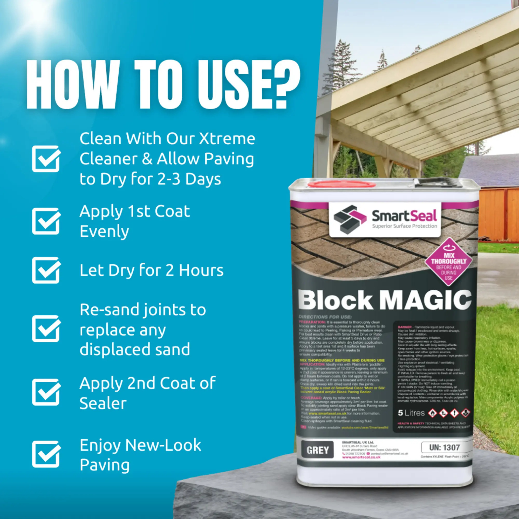 Liquid UV stable pigments blended with acrylic resins and solvents create "block magic". Developed by Smartseal with older block paving in mind, it will not only recolour block paving but protect the paving from future colour loss, weeds algae and staining.