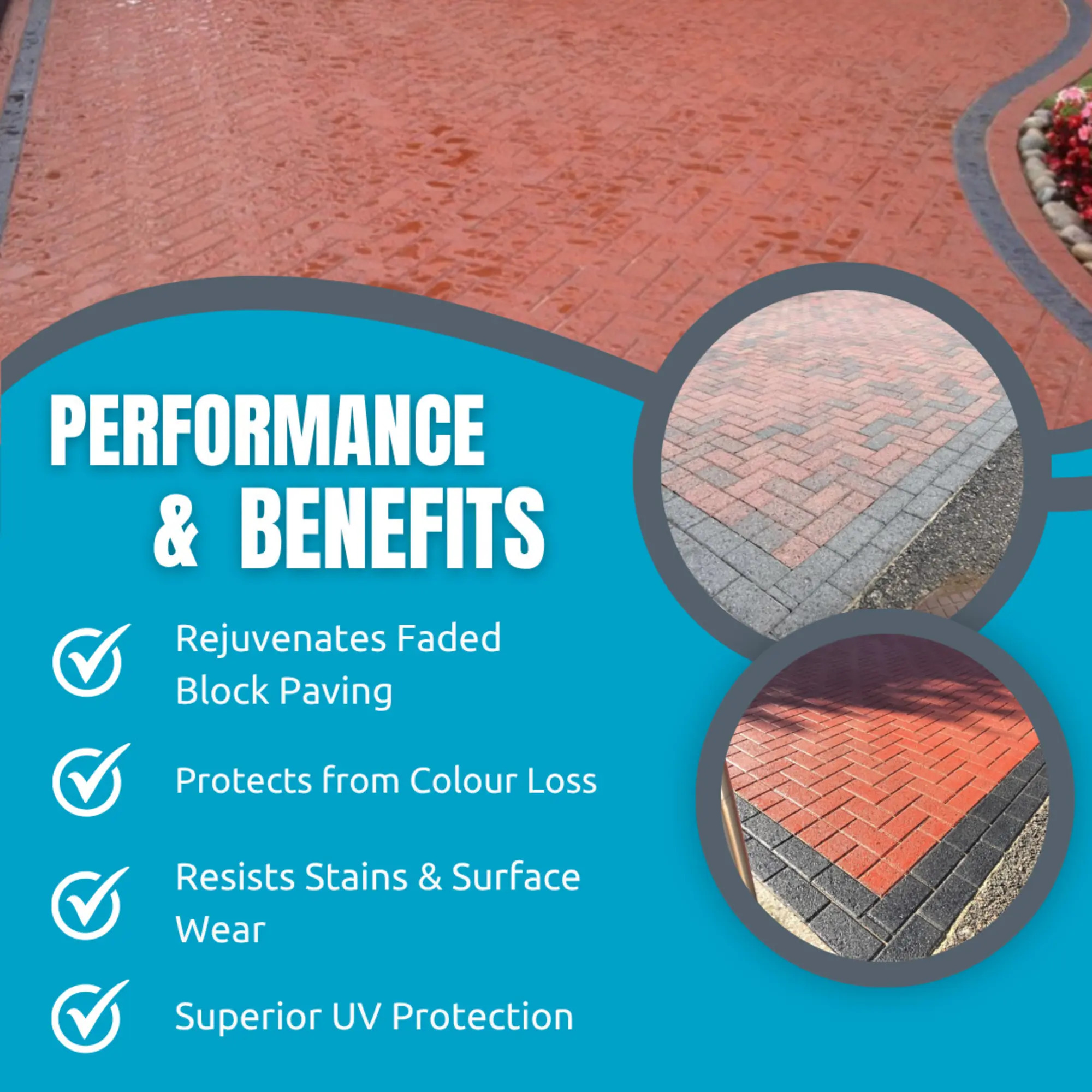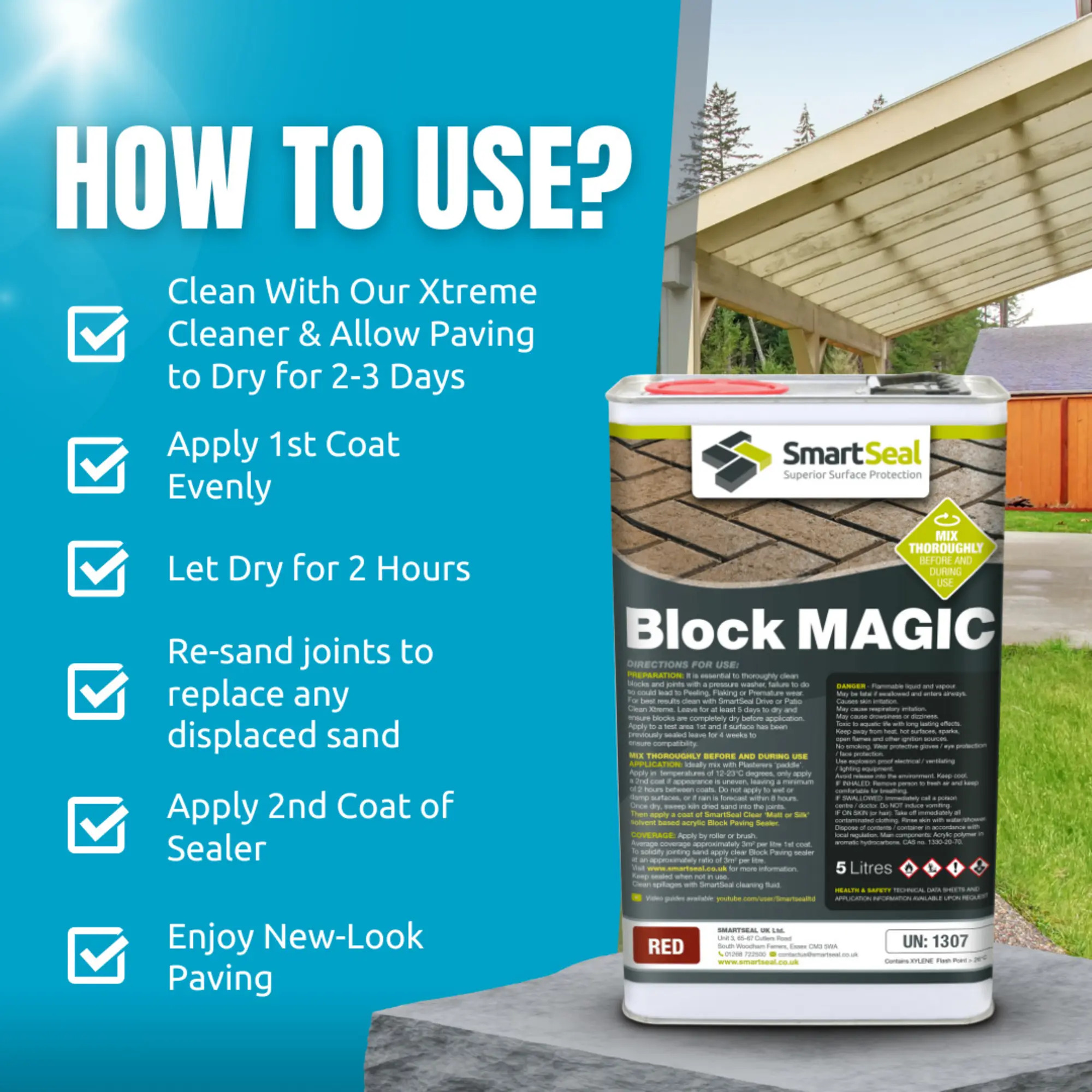 Liquid UV stable pigments blended with acrylic resins and solvents create "block magic". Developed by Smartseal with older block paving in mind, it will not only recolour block paving but protect the paving from future colour loss, weeds algae and staining.
