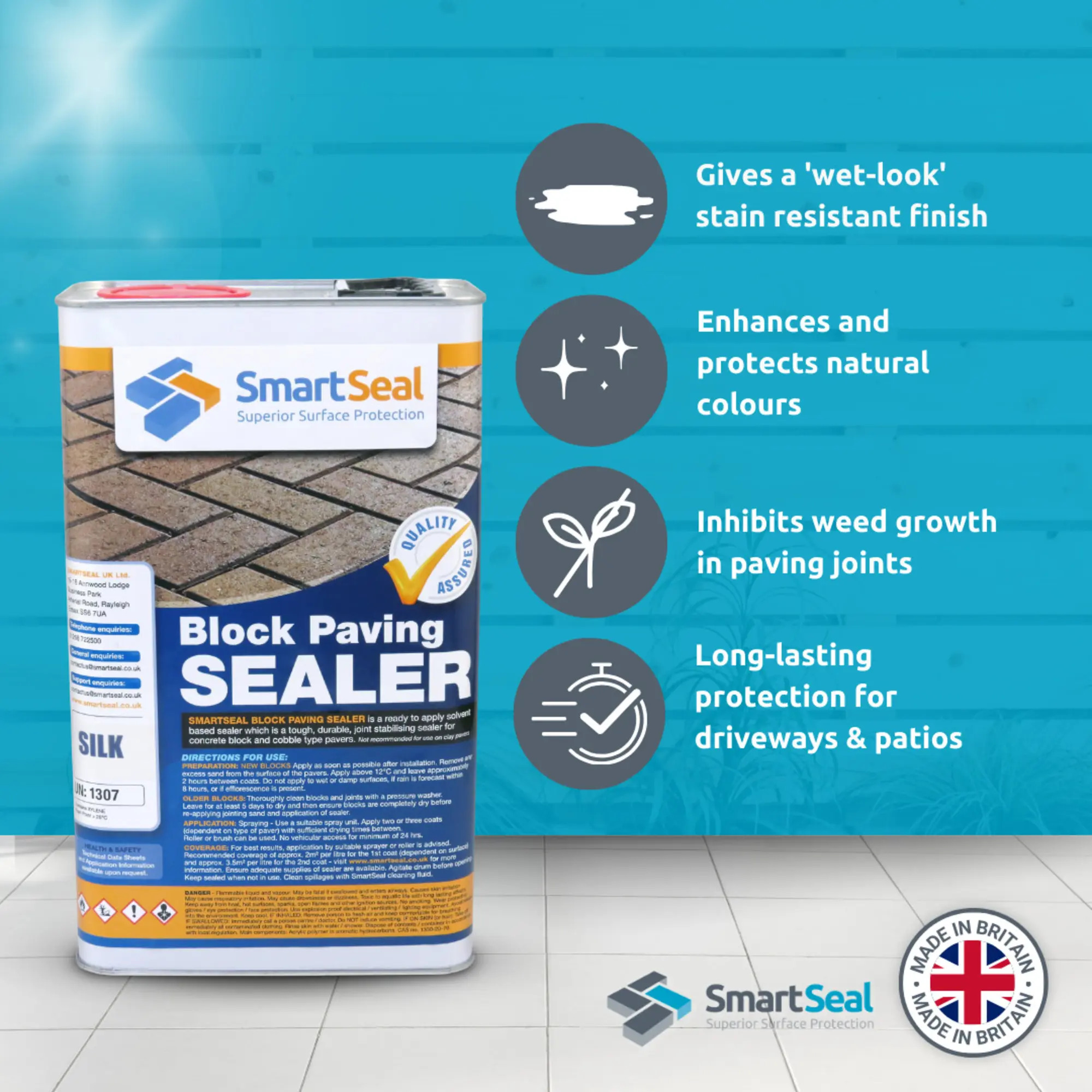 Newly laid block or flagstone paving shall be treated with Smartseal block paving sealer to protect and stabilise jointing sand and enhance surface colour and increase abrasion resistance. All materials should comply with ISO9002 for Quality Assurance. All work should be carried out in conjunction with the manufacturers current technical data sheet and instructions for use.