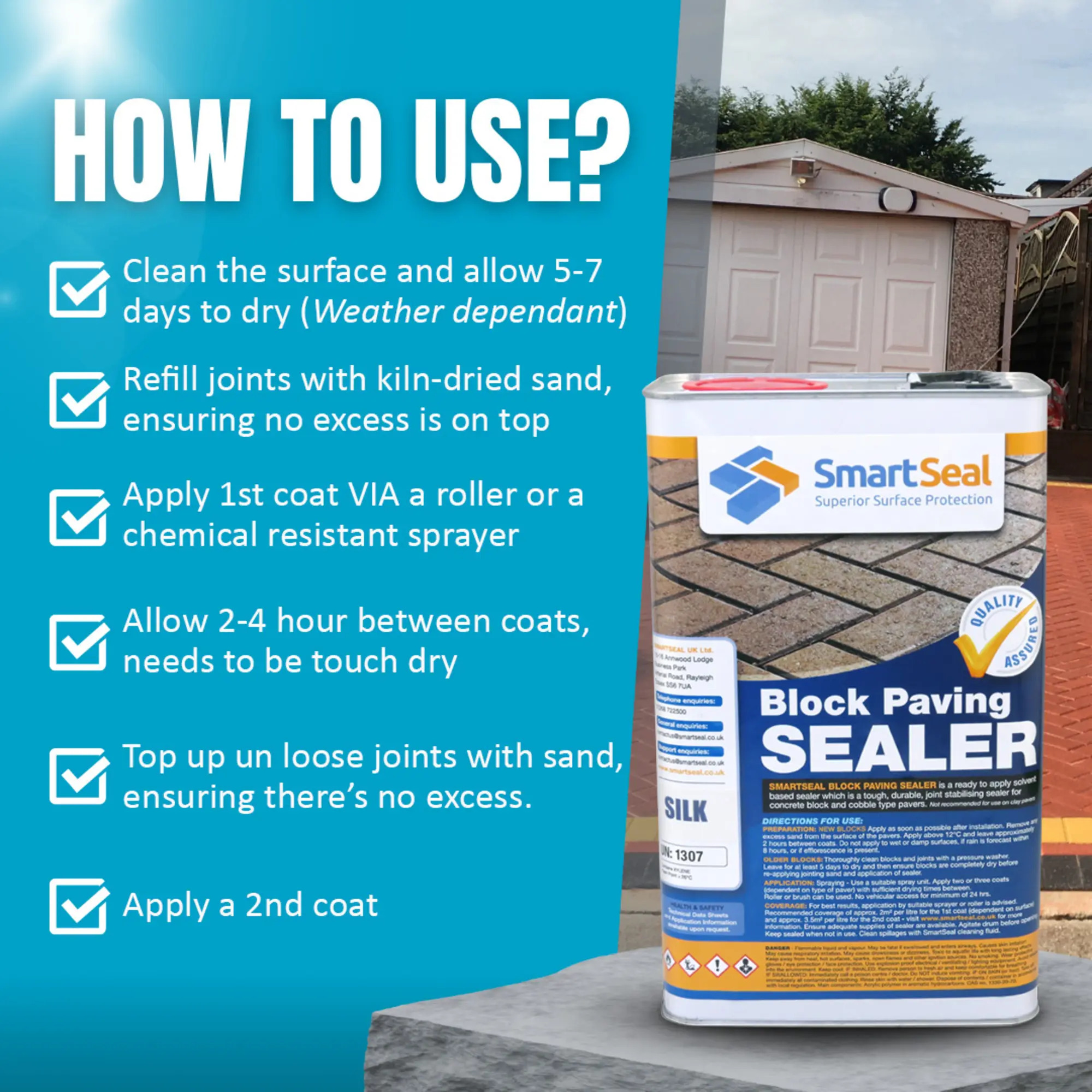 Smartseal Block Paving sealer can be applied using a sprayer unit or roller, at a rate of 2.0m2 per litre (pavers) 1st coat & 3.5 m2 per litre 2nd coat. A two-coat spray application is required to fully cover the jointing sand. The sealer will be tack free within 2 hours at 20°C and foot traffic may be permitted after 4 hours. Vehicles should be kept off the sealed area for a minimum of 24 hours at 20°C. These times may be increased or reduced depending on the ambient temperature. During the curing cycle, protect from rain. Do not apply when the ground temperature is above 22°C or below 12°C. All equipment should be cleaned with Smartseal cleaner fluid after use.