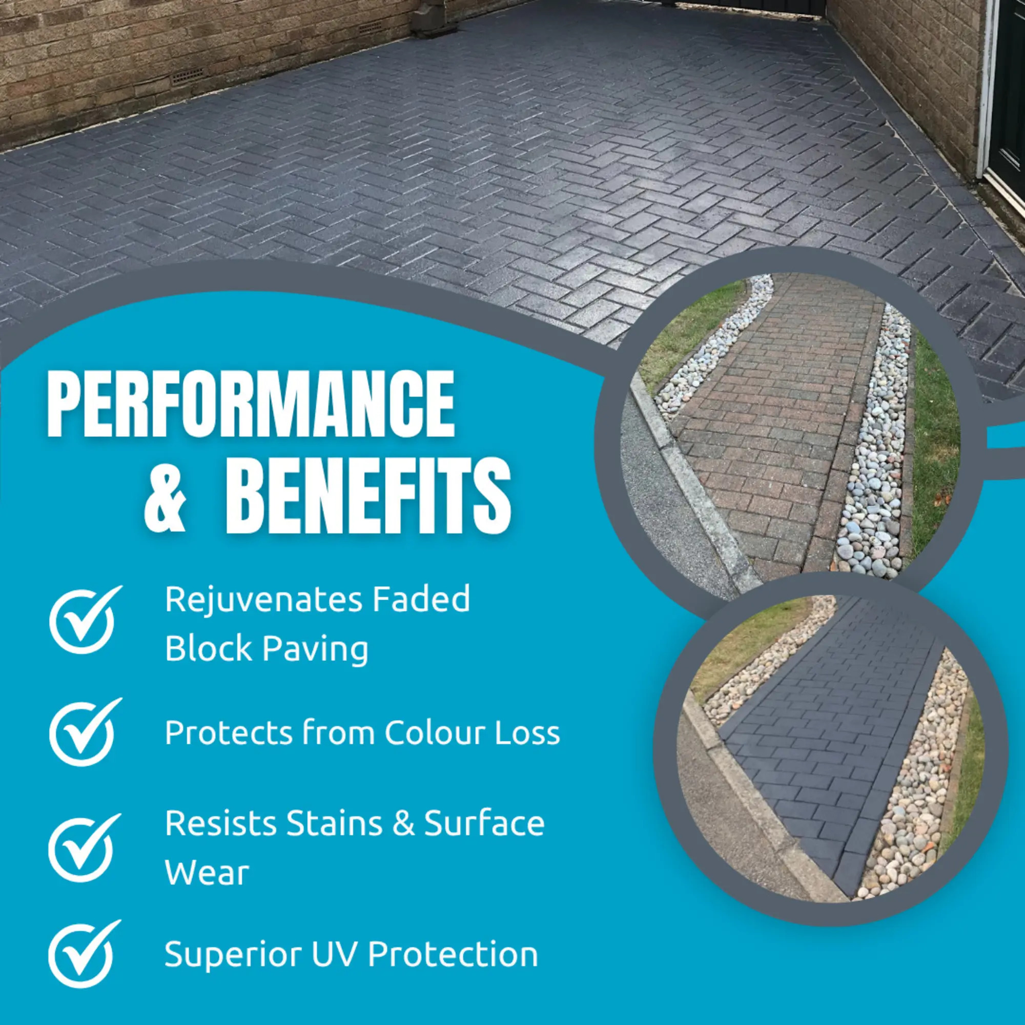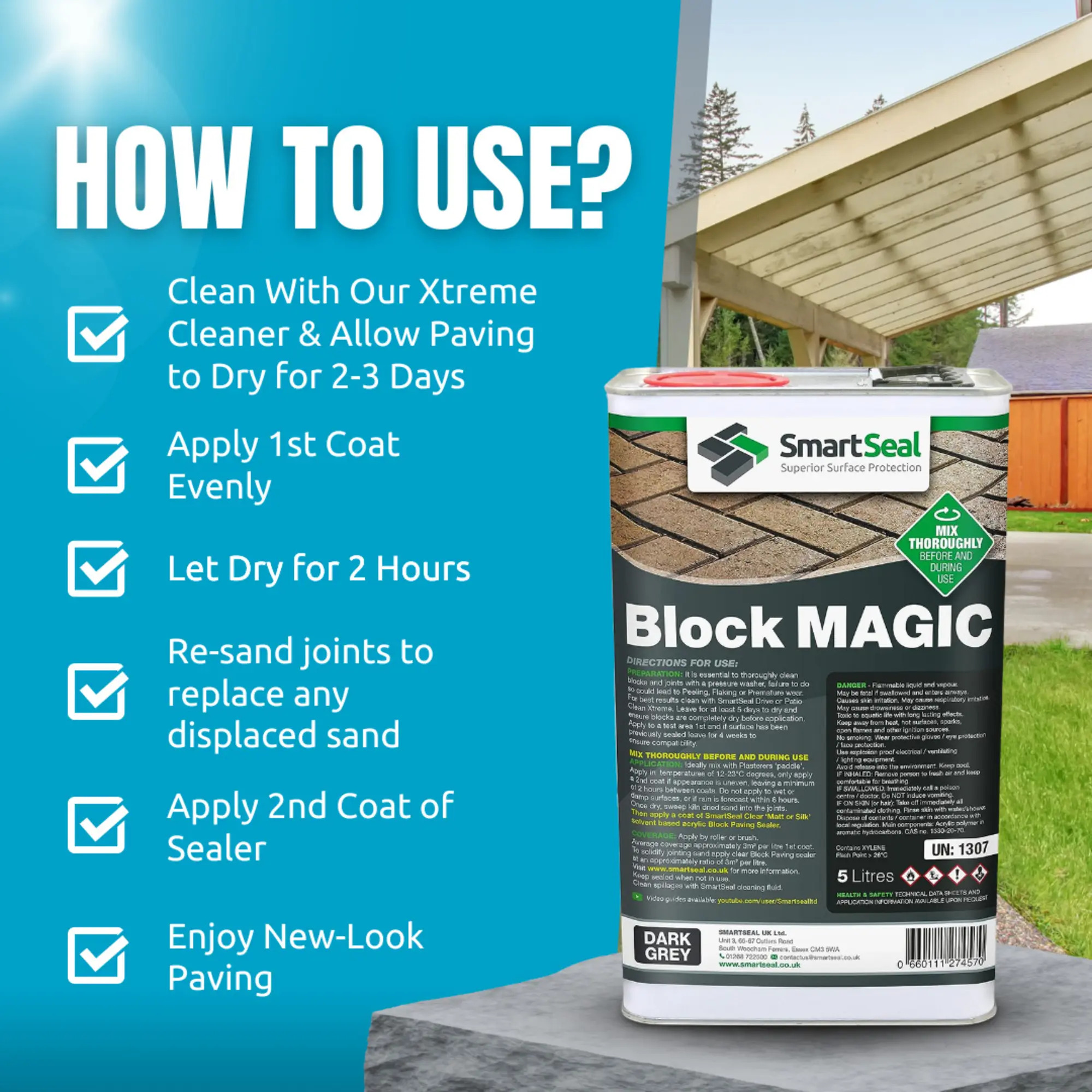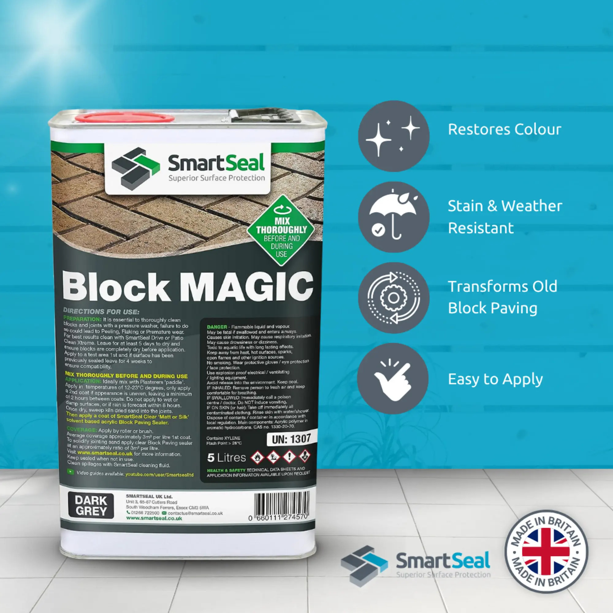 Liquid UV stable pigments blended with acrylic resins and solvents create "block magic". Developed by Smartseal with older block paving in mind, it will not only recolour block paving but protect the paving from future colour loss, weeds algae and staining.