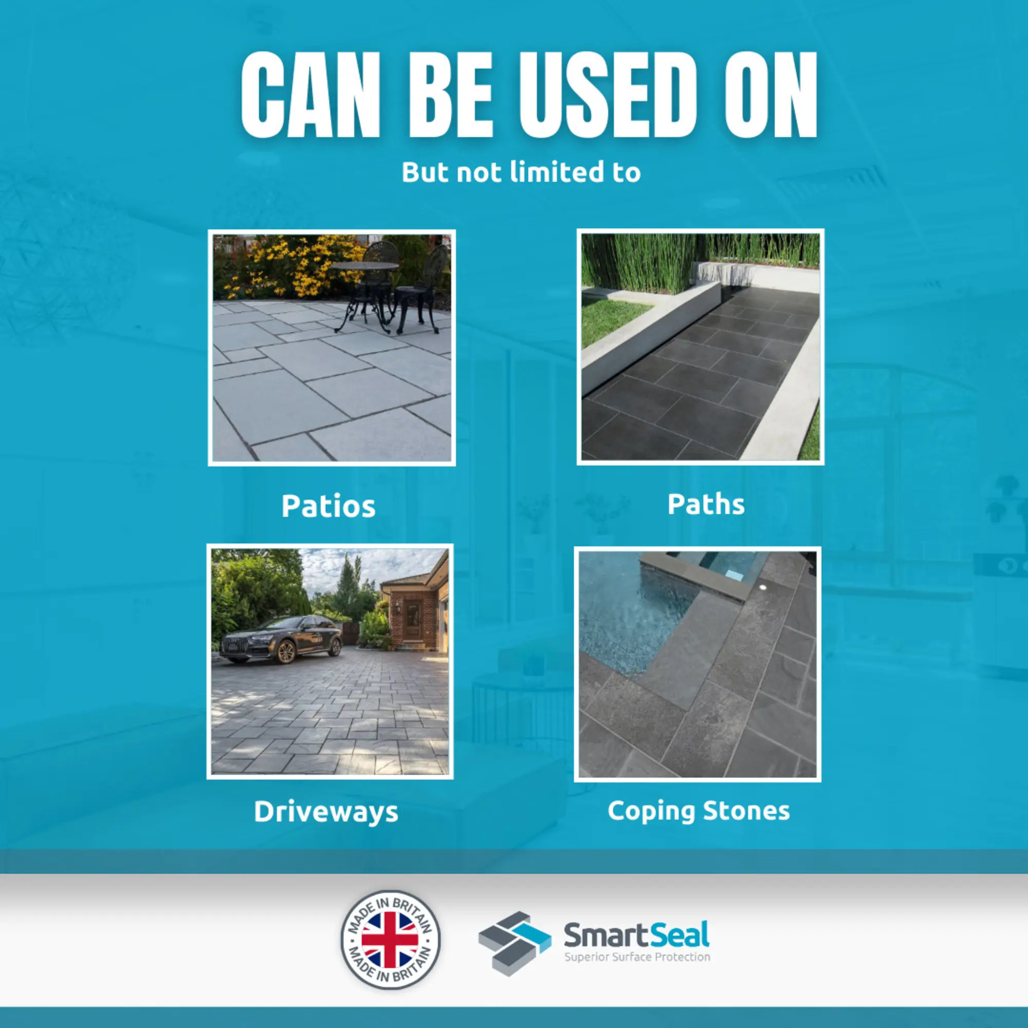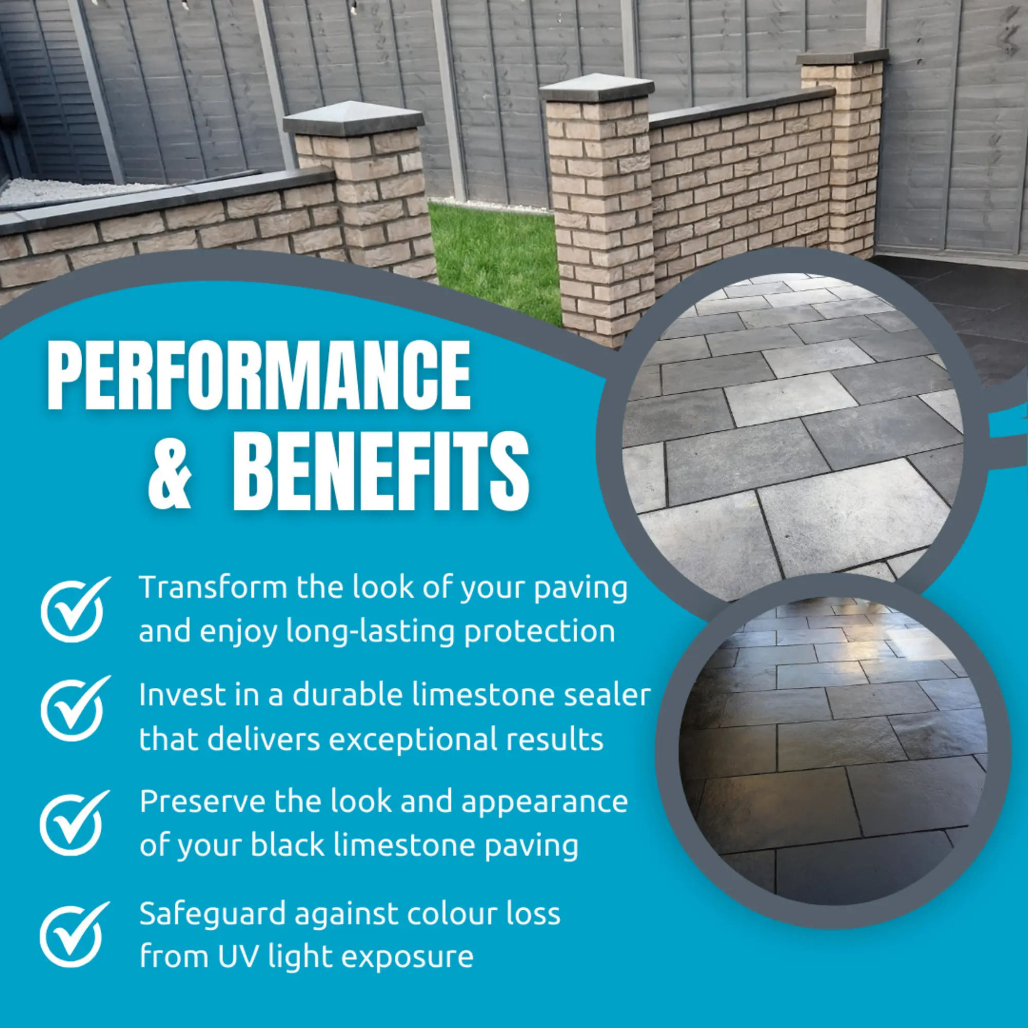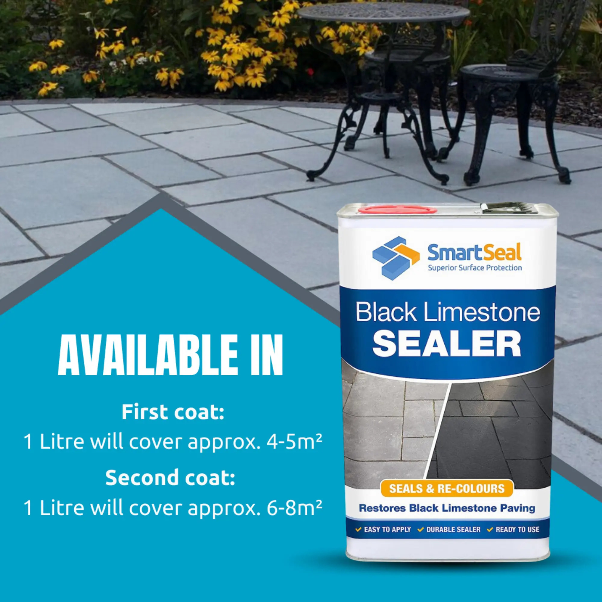 Limestone slabs will often fade over time and gradually turn a lighter shade of grey. The black limestone sealer can transform the look of faded limestone patios and make them look like they were recently laid. The sealer can be re-applied at any time to ensure any limestone slabs on patios or other external surfaces look good at all times.